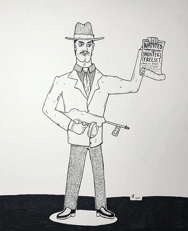 Freese creates whimsical and charming drawings, displaying simple concepts that you would never see in reality. For example, a llama smoking a cigarette. In his fun animal drawings, each one comes matted, framed, and signed starting with a price point of $250 or so, almost all his 5 x 7 prints are practically sold.
